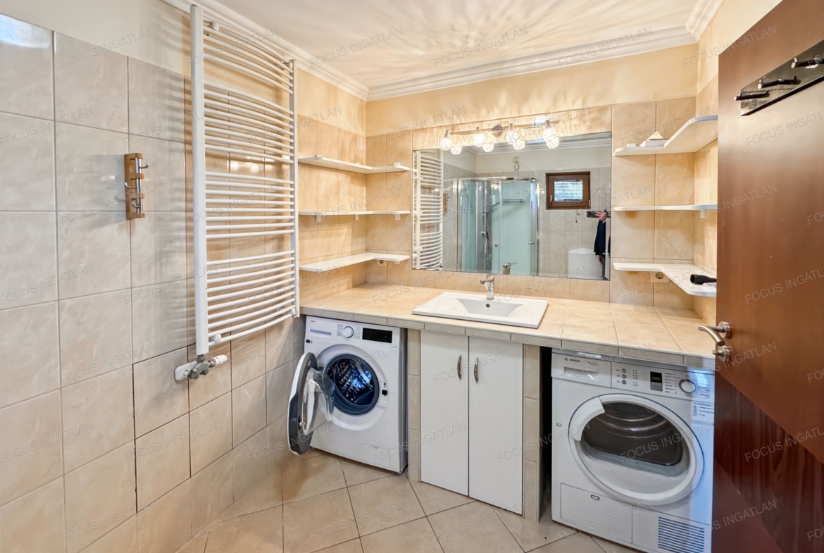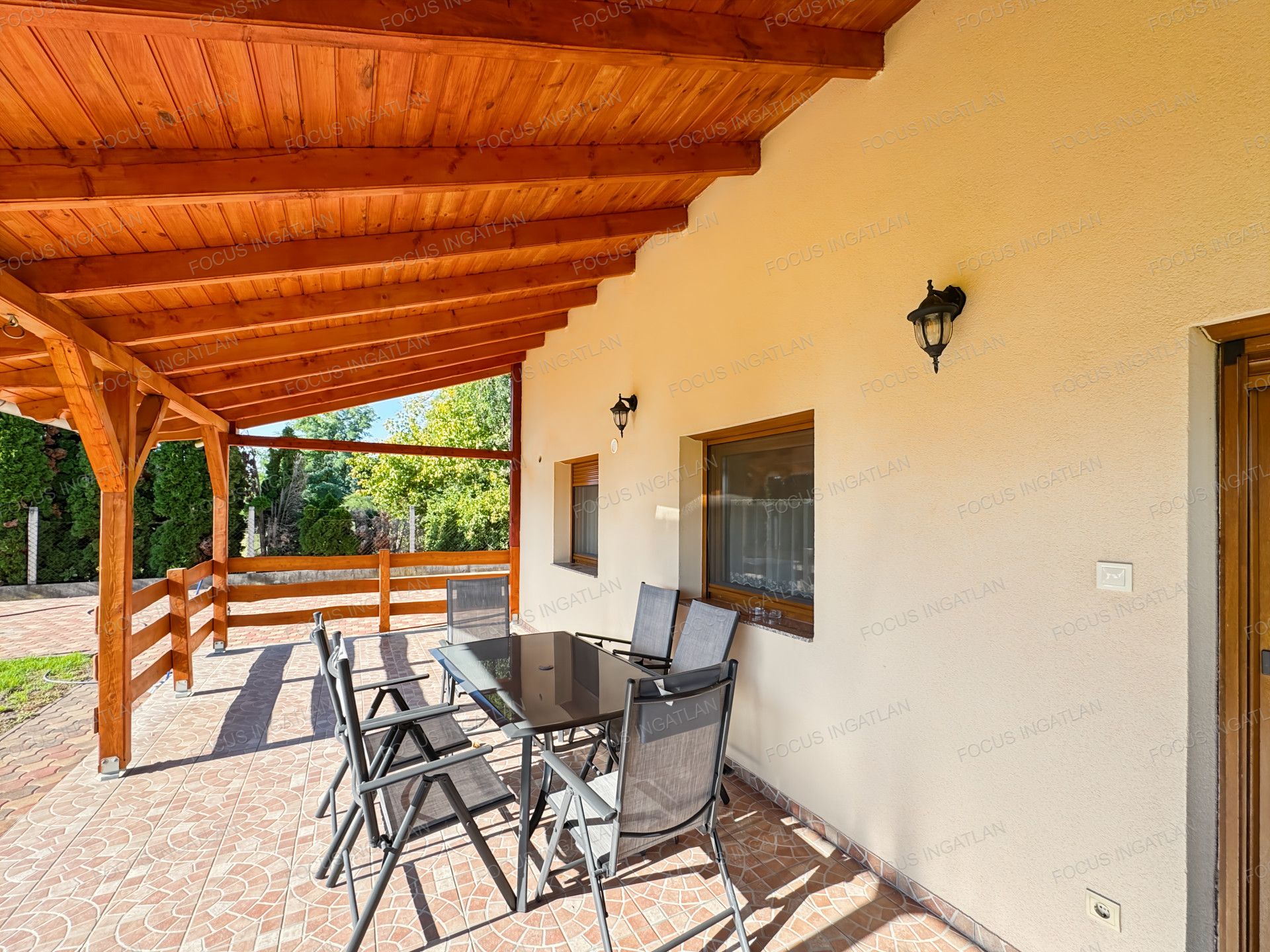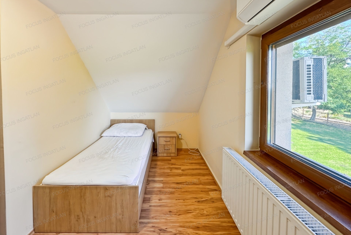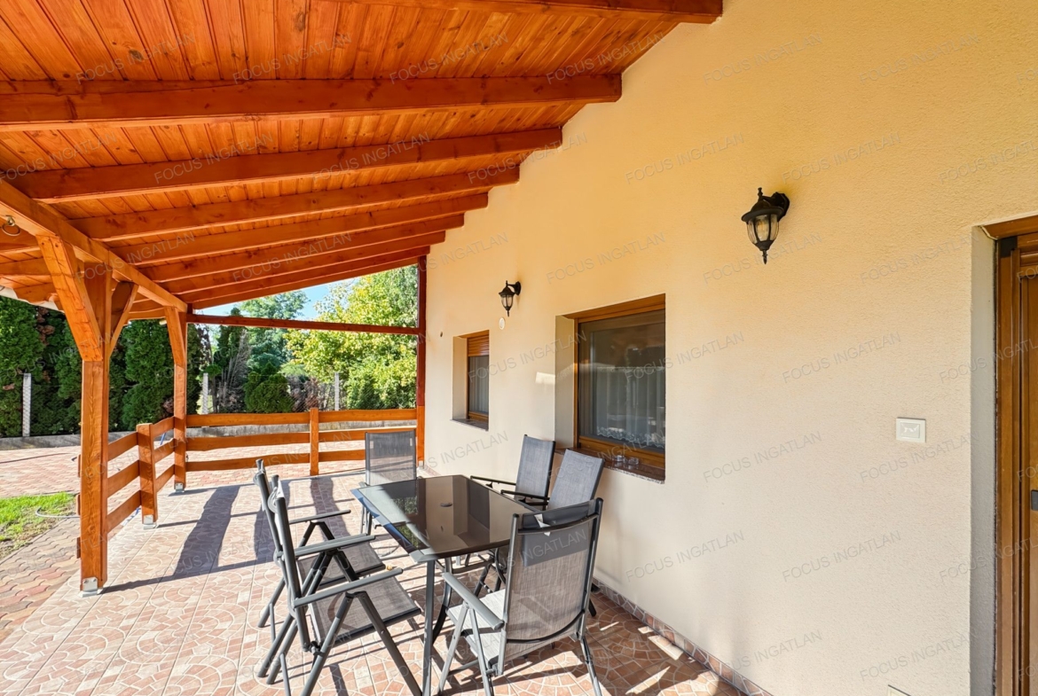A tágas, 2000 nm-es udvar térkövezett, az elektromos kapu kényelmes bejutást biztosít. A házban klímák, beépített szekrények és riasztórendszer is található, és teljes bútorzattal együtt vehető bérbe. A műanyag ablakok redőnnyel felszereltek, a szigetelt falazatnak köszönhetően pedig a fenntartási költségek kedvezőek.