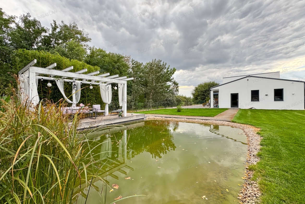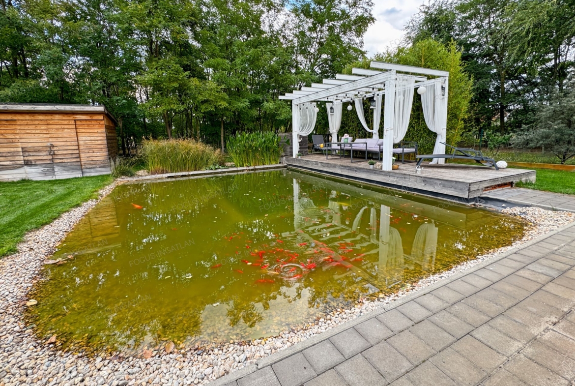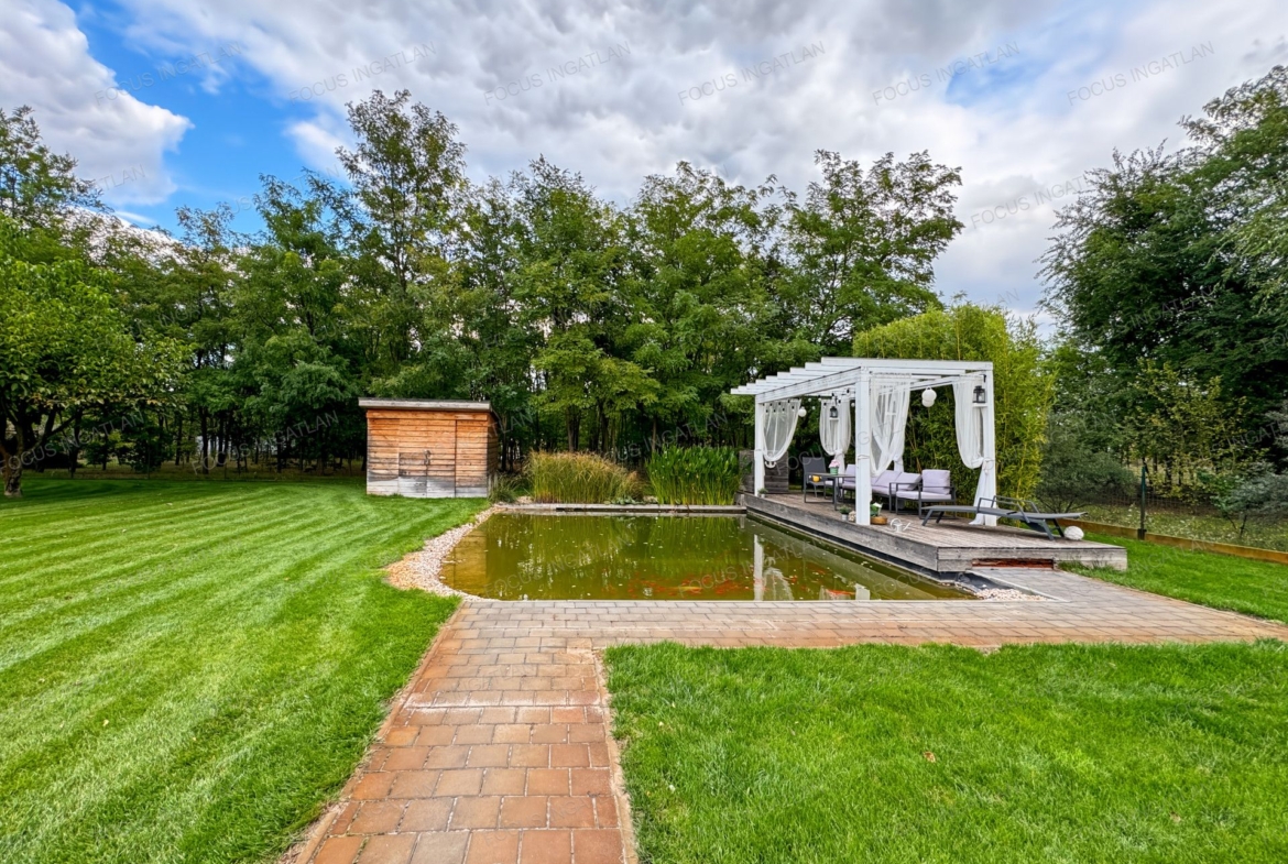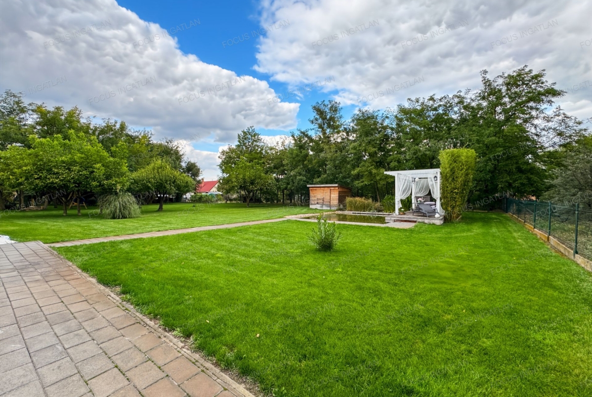 Kert: Automata, 4 zónás öntözőrendszer (fúrt kútról), dísz és fürdő tó, érett növényzet és hangulatos térkövezés.