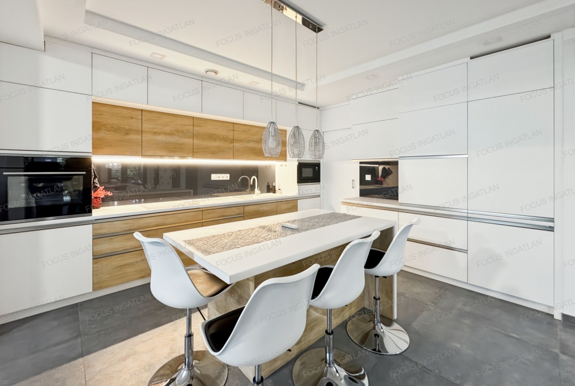 Konyha: A háziasszonyok álma – egyedi tervezésű, magasfényű bútorzat, beépített prémium Electrolux gépekkel és konyhaszigettel.