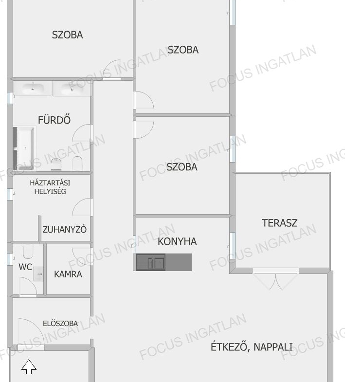 – 102 m2 lakrész, nappali + 3 szoba, kamra, háztartási helyiség, dupla fürdő + különálló wc